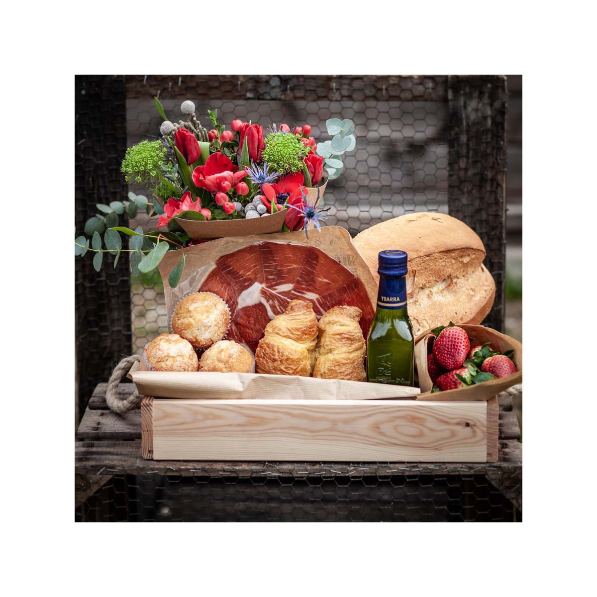 Incluye caja de flores variadas, pan de pueblo, blíster de jamón ibérico, botellita de aceite de oliva, magdalenas caseras, croissant caseros y fresas.